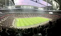 Tottenham Hotspur were formed by a group of schoolboys, and those who attended their matches in the early days were likely to be friends and families.[37] Their matches soon attracted the attention of the locals in the growing suburbs of Tottenham, and the first competitive game by Tottenham in 1885 recorded a figure of 400 spectators. Within a few years the home matches of the club drew crowds of up to 4,000, although these were non-paying spectators as they played on public ground at that time. Tottenham moved to an enclosed ground at Northumberland Park where they can charge an entrance fee in 1888, and joined the Southern League in 1896. In their first few years in the league, the attendance averaged at around 2,000.[38] A United League match against Arsenal in 1898 drew 14,000 spectators, and such high attendances necessitated a move to a larger ground.[39]