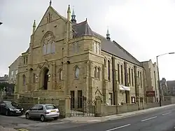 Running along Market Street, Tottington features a number of independent retailers including a veterinary practice,[33] plus restaurants, a post office and a medium-sized Co-Op Food store. There are five pubs including the Old Dungeon Inn,[34] which backs onto the Tottington Dungeon. Live music was regularly played at the Hark To Towler pub before it was closed and converted to apartments in 2018.[35] Tottington Primary School[36] and Tottington High School[37] are both rated good by Ofsted. There are four churches in the town; St Anne's Church of England (1799),[38] St John's Free Church of England (1867)[39] Tottington Methodist Church (1905) [40] and St Hilda's Roman Catholic Church (1963).[41] Tottington Medical Practice opened in 1995 and houses 8 GP surgeries.[42]