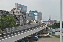 Toudao Street Station (simplified Chinese: 头道街; traditional Chinese: 頭道街; pinyin: tóu dào jiē) is a station on Line 1 of Wuhan Metro, opened upon completion of Line 1, Phase 2 on July 29, 2010.[1] It is an elevated station located on Jiefang Avenue, close to Second Wuhan Yangtze River Bridge. There are two side platforms and two tracks at Toudao Street Station. A prefabricated bridge was installed south of the station to pass over railroad traffic at the Jiang'an Rail Yard, a freight yard which has since been demolished and redeveloped.