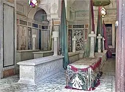 The south-west side opens into the chamber of the Beys,[1] the most important chamber in the complex, housing the tombs of thirteen reigning Beys.[7] The chamber is square, with walls fifteen metres long, and it replicates the proportions of an Ottoman mosque: four large cruciform pillars support a large central cupola which is slightly bulbous in form and flanked by four demi-cupolas on the sides and four in the corners. The only other building with this form in the medina of Tunis is the Sidi Mahrez mosque.[1][5] The intricate decoration of the room blends Italian, Ottoman and local influences; the lower parts of the walls and the pillars are covered in panels of polychrome marble marquetry to a height of 2.5 metres, while finely-sculpted plaster lines the caps of the cupolas.[5]
