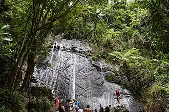 In the 1950s, the focus of tourism shifted to cultural and natural heritage travel with the federal designation of the San Juan National Historic Site and the historic district of Old San Juan being restored by the Puerto Rican government in order to attract visitors interested in the colonial history of the island.[8] The designation of La Fortaleza and San Juan National Historic Site in 1983 as the eleventh World Heritage Site under U.S. jurisdiction further helped cement San Juan as a national and international tourist destination.[14] Ecotourism later grew with the establishment of visitor infrastructure in El Yunque National Forest, the only tropical rainforest in the National Forest Service system, and with the development of natural heritage tourist destinations in the form of state forests, recreational areas and parques nacionales, the Puerto Rican equivalent of state parks, between the 1950s and 1980s.[15][16][17] Other tourist activities such as fishing also became popular in the second half of the 20th century with Puerto Rico being considered one of the best places in the world to catch Atlantic tarpon.[18]