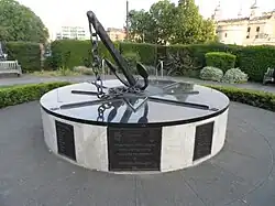 Since 2000, 3 September has been celebrated annually as Merchant Navy Day; a memorial service is held close to that date at the Tower Hill Memorial.[47] In 2005, the Merchant Navy Association unveiled another memorial on the site. The work of Gordon Newton, it is dedicated to the Merchant Navy and Royal Fleet Auxiliary casualties of the 1982 Falklands War. It consists of a 3-metre (9.8-foot) bronze sundial, raised on a granite base; at the dial's centre is a large bronze anchor. Around the base are bronze plaques, one of which contains the inscription IN MEMORY OF THOSE MERCHANT SEAFARERS WHO GAVE THEIR LIVES TO SECURE THE FREEDOM OF THE FALKLAND ISLANDS 1982. The others record the names of the 17 dead, ordered by ship. The Falklands memorial, which is not listed, was unveiled on 4 September 2005 by the First Sea Lord, Admiral Sir Alan West and is maintained by the Commonwealth War Graves Commission (the IWGC having changed its name in 1960).[2][48]