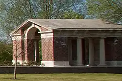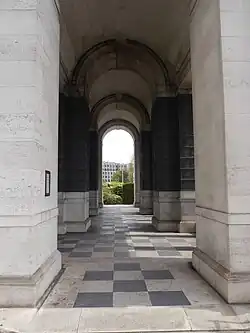 In his biography of Lutyens, Michael Barker described the design as "dignified classicism";[23] another Lutyens biographer, Christopher Hussey, described it as a "classical shrine".[24] Tim Skelton, author of Lutyens and the Great War, notes the similarity of the colonnade to the shelter buildings in Lutyens' cemeteries in France and Belgium and suggests that the memorial would be "equally well at home on the Western Front as in the heart of London".[25] The resemblance to the cemetery buildings is also noted by the Dutch architect Jeroen Geurst, who compares it in particular to those at Hooge Crater in Belgium and Serre Road in France.[26] In the opinion of the historian David Crane, the memorial never recovered from its "miserable start" and is consequently the least well-known of the IWGC's major works following the First World War.[6]