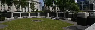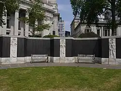 The Second World War memorial takes the form of a semi-circular sunken garden located behind the First World War Memorial, to its north in Trinity Square Gardens. The idea of a sunken garden appears to have originated from discussions immediately following the end of the war. There was a feeling among the new generation of artists and architects that the elaborate and artistic memorials to the First World War did not capture the national mood of mourning for the new wave of casualties and that spaces such as gardens, which provided a location for individual mourning and reflection, were more suitable. According to the architectural historian Philip Ward-Jackson, Maufe's memorial gives the impression of being a wing of an imaginary ruined church, complete with provided seats—an image which would have had "powerful resonance in the bombed City" (much of the surrounding area, including the Port of London Authority building, was severely damaged by German bombing).[35][36] The architectural historian Nikolaus Pevsner described Maufe's extension as "less assertive" than the original memorial; he praised the idea of a memorial to the missing in the form of a void (the sunken garden), but felt it was let down by Wheeler's "strangely jaunty" reliefs between the lists of names.[37]