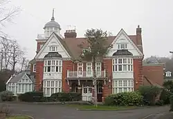 Tower House, "Brighton's finest example of a grand Edwardian house",[8] is an "imposing and richly detailed" building[6] which—despite being set back from the main London Road—forms a local landmark due to its tall corner tower with a large lead cupola.[7] This has ogee curves and sits on top of an octagonal timber roof lantern.[2] The house is constructed of red brick in the Edwardian/Queen Anne Revival style.[2] It rises to 3–4 storeys and has a six-window range. The four-storey tower at the south corner is recessed; the main building has a symmetrical façade composed of two projecting gabled wings with two-storey bay windows and a central recessed three-bay entrance wing. This has a porch in the form of a three-arched arcade, above which projects a wooden balcony. On the roof between the gables is a small dormer window with a curved gable on which is painted the year 1902[14] and the Savage family's monogram.[8] Further back on the south side is a gabled single-storey conservatory. To the rear are another two gabled wings, the gables tile-hung and with cornices. There is also a wide ironwork veranda. Some original features survive inside, including an arched fireplace, decorative panelling and a Doric-columned arcade,[14] but the central divided staircase and a stained glass ceiling which illuminated the entrance hall were removed during the renovations of 1988.[8]