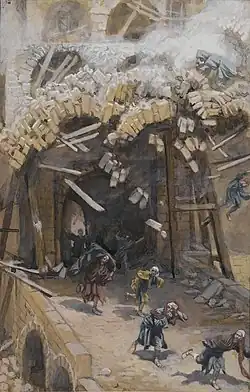 The Tower of Siloam (Greek: ὁ πύργος ἐν τῷ Σιλωάμ, ho pyrgos en tō Silōam) was a structure which fell upon 18 people, killing them. Siloam is a neighborhood south of Jerusalem's Old City. In the Gospel of Luke, Jesus refers to the tower's collapse and the death of the 18 in a discourse on the need for individual repentance. The incident is mentioned only once in the New Testament, in Luke 13:4,[1] as part of a section with examples inviting repentance contained in verses 13:1–5.[2][3]