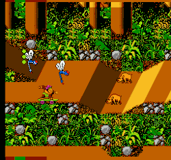 Gameplay involves steering Thrilla around obstacles, over pits and past creatures while collecting coconuts used in the shell game to gain extra lives, bananas to gain extra life, and powerups such as the handstand powerup which grants temporary invulnerability to all manners of danger but pitfalls.[2] Enemies include elephants, giraffes, giant spiders, carnivorous plants, spear-wielding humans, snakes, electric eels, and many others.