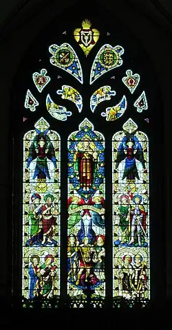 An organ, possibly by John Lincoln, was installed in 1811.[4] In 1874 the organ was under repair by Joseph Robson of London.[11] Despite this the organ was reconstructed by Maley, Young and Oldknow and reopened in 1877[12] and comprised 3 manuals and pedals with 21 speaking stops and a spare slide on the Swell. During this reconstruction it was moved to the north side of the choir from the old organ loft which was then demolished. The trumpet stop was replaced with another by Mr Oldknow in 1887.[13] Three stops were added to the swell in 1888[14] and he also added a 16 ft pedal reed in 1895[15]