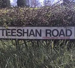 Many of these land division terms have been preserved in the names of modern townlands. For example, the term "cartron" in both its English and Irish forms has been preserved in the townland names of Carrowmeer, Cartron and Carrowvere, while the term "sessiagh" survives in the names Shesia, Sheshodonell, Sheshymore and Shessiv.[12] The terms "ballyboe" and "ballybetagh" tend to be preserved in the truncated form of "bally" as a prefix for some townland names, such as Ballymacarattybeg near Poyntzpass, County Down. Less well-known land division terms may be found in other townland names such as Coogulla (Irish: Cuige Uladh, "the Ulster fifth"), Treanmanagh (Irish: an train meánach, "the third middle") and Dehomade (Irish: an deichiú méid, "the tenth part").[12]