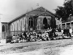 In 1893, a vacant Congregationalist church building and contents were purchased and re-erected on the Sturt Street site.[2][3] The first service was held in November 1893. In January 1903 the building was damaged by Cyclone Leonta. A church hall was erected using the remains that was salvaged. However, Church records from 1912 reveal that this structure was intended to be temporary. A building fund was set up for a new church and hall, but it was not until 1922 that a replacement church was built. Lack of funds precluded a completely new building. Therefore a second hand one was found in the form of a disused powder magazine, eight miles from Townsville at Brookhill and purchased. The congregation dismantled and cleaned around 30,000 bricks. The building contract was signed for £832/6/- and the foundation stone was laid on 8 July 1922. It is highly likely that at this time the old timber church hall was attached to the rear of the new church.[1] The new church opened on Saturday 23 September 1922.[4][5]