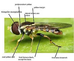 Toxomerus geminatus (Say,1823) the Eastern Calligrapher, is a common species of syrphid fly observed in the eastern and central United States and Canada.(see map) Syrphid flies are also known as Hover Flies or Flower Flies because the adults are frequently found hovering around flowers from which they feed on nectar and pollen. Adults are 6.1–7.6 mm (0.24–0.30 in) long. The larvae are predators of a variety of aphids and mites.[1][2][3]