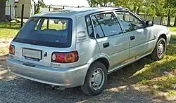 The 1.3-litre sedan has a four-speed manual transmission (later all 1.3-litre engines had five-speeds) or a three-speed automatic transmission. The Full-Time All-Trac 4WD sedan is powered by the 1.6-litre 4A-F and first went on sale in October 1987.[4] The manual transmission version has a manually locking centre differential, whereas the automatic versions have a hydraulically operated limited slip unit ("Hymatic").[4] The 1456 cc 3E engine was only fitted to the Japanese market Van (wagon) commercial version.[5] The only sedan with the high output 1.5-litre 5A-FHE engine was the SE-Limited G; the FX (hatchback) received this engine in the FX-VS and FX-ZS models.