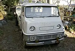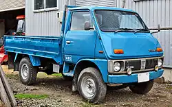 The semi-cab over layout was retained for the second-generation Toyopet ToyoAce, initially sold as the SK20.[6] The new SK20 was also sold as a panel van (SK20V) and as a double-cab truck (SK20P). The sidevalve 1 liter engine's power remained 33 PS (24 kW), as for its predecessor.[6] It was introduced in March 1959, but already by October that year it underwent a facelift and received a new engine, the 1.0-liter 45 PS (33 kW) P type. This was the PK20 series. Australian versions were badged as a Toyota 25. Later yet, 1.25 and 1.5 ton versions were added, with more powerful 1.2 (2P) and 1.5-litre (R) engines. This picture is a PK3# with two single lights, the upgrade added in 1966 was the PK4# series which was fitted with the R engine. After the initial S-engined series, there were only PK models even though they were being powered both by the P and R series engines. This was to set it apart from the Stout which used the "RK"-series chassis numbers. In a May 1967 facelift, the car received quad headlights and a 3P-engined (1.35 L, "PK32") version was added.[7][8]