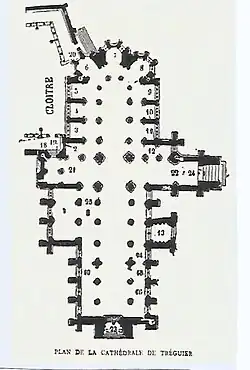 1- Chapelle Saint-Yves or Choeur du Duc 2- Chapelle Saint-Jean 3- Chapelle Sainte-Anne 4- Chapelle Saint-Nicolas (today known as Mont-Carmel) 5- Chapelle Saint-Martin (today known as Saint-Joseph) 6- Chapelle Saint-Jérôme (today known as Sainte-Philomène) 7- Chapelle de la Sainte-Croix 8- Chapelle Saint-André 9- Chapelle Saint-François d'Assise 10- Chapelle Saint-Tudual (today known as Notre-Dame de Bon-Secours) 11- Chapelle du Sacré-Coeur 12- Chapelle du Rosaire et des Trépassés 13- Chapelle des Fonds 14- Enfeu of a cathedral cantor 15- Enfeu of a knight 16- Enfeu of a knight 17- Enfeu df Canon Jean de Lantillac 18- The "Hastings" tower 19- Portal known as "Saint-Jean" 20- Portal known as "Saint-Jérôme" 21- Transept north 22- Transept south 23- The West porch 24- The South porch 25- The Saint Yves cenotaph