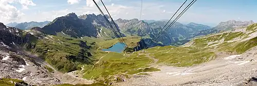 Trübsee (1,788 m (5,866 ft))[1] is an intermediate cable car station by the Titlis Bergbahnen, Trüebsee (lit.: turbid lake, Germanized: Trübsee[2])[1] is an Alpine lake (1,764 m (5,787 ft)) on the Ober Trüebsee Alpine pasture (or often just incorrectly shortened to Trüebsee)[1] in the upper part of the extensive municipality of Wolfenschiessen in the Swiss canton of Nidwalden. The lake lies at the foot of the Titlis above the village resort of Engelberg. It can be reached from the village by cable car, or via several alpine walking paths, e.g. the Pfaffenwand. The first aerial cableway was built in 1927 from Gerschnialp, that could be reached with Gerschnialpbahn.