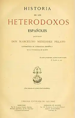 A scholar considered by some the greatest figure of late 19th century Traditionalism is Marcelino Menéndez Pelayo,[68] who published most of his key works in the 1880s and 1890s.[69] Historian of political thought and literary critic rather than a political theorist himself, he championed Traditionalism as a cultural approach, defined as constant defense of orthodoxy based on Catholicism though embodied in vastly different locals realms of Hispanidad.[70] Erudite to the extreme politically he neared the Conservatives and briefly served as MP;[71] some scholars refer also to "menendezpelayismo político";[72] most, however, limit themselves to "menendezpelayismo". Some deny him Traditionalist credentials altogether.[73]