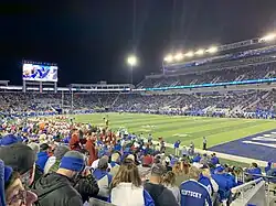 Along with The Wildcat and Scratch, Kentucky has routinely kept a live bobcat as a mascot. The first Wildcat would attend games at Commonwealth Stadium (now Kroger Field), however there is disagreement as to whether the first Bobcat was named "Fuzzy" or "Tom".[5] After the first bobcat, the university would introduce "TNT" and "Whiskers", however neither enjoyed being kept in captivity. For this reason, their attendance of Football games was suspended. In the 1940s, the university introduced "The Kentucky Colonel," who was human-friendly and affectionate, and returned to the Football sidelines. After The Kentucky Colonel, the university introduced "Baby", though she did not enjoy captivity. After Baby, the university decided to maintain a live mascot, however would not allow them to attend Football Games. As of 2025, the University of Kentucky has "Blue", a live bobcat kept at the Salato Wildlife Education Center near Frankfort, KY.[6][7]
