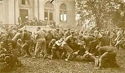 During the late 19th and early 20th century, several forms of annual physical contests developed that pitted the freshmen classes against the sophomore class. In the 1890s and 1900s, the freshmen class and the sophomore class engaged in an annual "color rush" battle, where members of the freshmen class had strips of fabric sewn into their jackets after Monday chapel service and were led into the lawn between Old Main and Thompson Library.[10] Members of the sophomore class would attack, attempting to take as many of the fabric strips as possible.[10] These battles often left bruised bodies and hard feelings, as combatants often lost whole articles of clothing amid the "scrap".[10] A similar event, the "pole rush," was founded in 1894 by the Class of 1897.[10] In the pole rush, the freshman class raise their flag on a flagpole on campus and the sophomores would attempt to bring it down.[10] Traditionally, the combatants would resort to dirty tricks to win, including dousing the opposing team with a "shower of ancient eggs and flour."[10] By 1908, the rules were changed to prevent injuries, which had become commonplace.[10] During the 1880s, the "cane rush" was traditionally a physically violent contest, where a member of the freshman class would taunt a sophomore with a cane, daring him to take it away from him.[10] Next, 10 freshmen would place their hands on the cane, with a number of their classmates surrounding them, while the sophomores would run at the group, seeking to take the cane.[10] After 12 minutes of bloody fighting, whichever class had the most hands on the cane would be the winner.[10] The cane rush was seen as a rite of passage for freshmen.[11] The rules of play changed over time; at times the cane was hidden on campus, with the object of the game to find the cane before the other class.[9] The rushes, which had devolved from an annual rite of passage into serious physical violence, were banned by the faculty in 1913.[10]