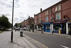 The Village was almost completely self-contained, with its own shops, public hall, post office, police station, school, social club, and sports facilities.[81] Three corrugated iron churches were built: a Methodist chapel in 1901, St Cuthberts (Church of England) in 1902, and the Roman Catholic St Antony's in 1904.[79] St Cuthbert's was replaced by a brick building, but closed in 1982.[82] Only St Antony's remains open; it contains the altar and a stained glass window from the chapel at Trafford Hall, donated by Lady Annette de Trafford.[83] The Village's design attracted criticism from the start; the streets were narrow, with few gardens, and the whole development was close to the pollution of the neighbouring industries. It resembled the terraced properties in the surrounding areas, with many condemned as slums in later years. By the 1970s The Village was considered by Stretford Council to be a slum area, unsuitable for residential housing. In the first phase of clearance, during the mid-1970s, 298 houses were demolished. In the early 1980s 325 more were demolished, leaving only the largest 84.[84]