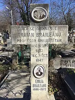 Brăileanu was sentenced to twenty years' imprisonment; another official jailed at the same trial was Ion Petrovici, a successor of his at the Education Ministry.[141] First held at Văcărești Prison before being moved to Aiud Prison,[134] Brăileanu continued working on translations of Aristotle, as well as on a memoir covering the early part of his life.[147] In 1947, he developed a severe ulcer and, gravely ill, was taken to the Brașov prison hospital. In June, a committee of doctors decided he did not require a hospital stay, and he was returned to Aiud.[134] He died there, most likely on October 3.[137] Shortly before, the prison doctor had refused to send him for an operation, and he was not allowed to access a package his relatives had sent.[148] His family managed to bring the body to Bucharest, where he was buried in an Orthodox ceremony at Sfânta Vineri Cemetery.[149] Others who occupy the same gravesite include his wife, who lived until 1972, and his father.[141]