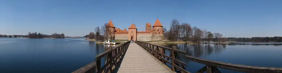 Trakai Island Castle (Lithuanian: Trakų salos pilis) is an island castle located in Trakai, Lithuania, on an island in Lake Galvė. The construction of the stone castle was begun in the 14th century by Kęstutis, and around 1409 major works were completed by his son Vytautas the Great, who died in this castle in 1430. Trakai was one of the main centers of the Grand Duchy of Lithuania and the castle held great strategic importance. The castle was rebuilt in the 1950s–1960s by Lithuanian initiative, although it had received resistance from Soviet authorities. The Trakai History Museum was established after the reconstruction.[3]