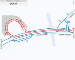 Small stub-ends also exist at Krowodrza Górka, Bronowice Male and Salwator termini, but they are used as spare tracks for defected and replacement cars, while double-ended trams use the balloon loop.