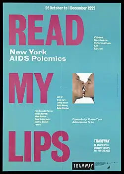 Exhibitions have included the seminal new works by Christine Borland and Douglas Gordon. In Autumn 1992, Tramway hosted a seminal exhibition Read My Lips: New York AIDS Polemics (exhibition catalogue editor Nicola White), featuring Gran Fury's advertisement/poster with a photo of bi-racial men kissing.[5][6]
