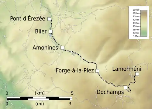 The line is the oldest and longest tramway in the province of Luxembourg, between Érezée and Dochamps. It is a 1,000 mm (3 ft 3+3⁄8 in) gauge line along the Aisne river.