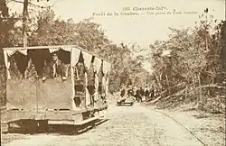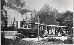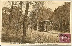 The metre-gauge forest railway originally started at the La Combe à Massé quarry in 1868. Initially used mainly by workers and employees for silvicultural work, the forest railway was also used by summer visitors after reforestation was completed. In the newspaper Le Gaulois of 21 July 1884 and 11 August 1884, an advertisement appeared for "visits by forest railway to La Palmyre, La Coubre, the Pavillon Bonne-Anse, the Pointe Espagnole, the Galon d'Or, the forest and dolmens of Combots, the forest of Arvert, etc."[4][17]