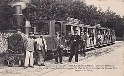 Steam tramway, ready to depart from Grande-Côte, 1904A steam train at the Casino de FoncillonSteam tramway in the sea-side resort of PontaillacSteam tramway at Café des Bains in Royan, 1930sInauguration of a Campagne petrol railcar (Automotrice) by Gaston Nougarède, director of the SGTR on the left in front of the railcar with black cap. View of the inaugural train departing from Ronce-les-Bains for the return journey of the guests, 1924.[3]