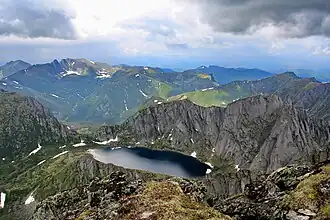 The Transbaikal Bald Mountain tundra ecoregion (WWF ID: PA1112) covers the high-altitude peak zones above the treeline in a series of mountain ranges that stretch from the northern reaches of Lake Baikal to the western coastal ranges of the Okhotsk Sea. Floral communities are those of mountain tundra, with bare rock or permafrost under layers of moss and lichen. Because the ecoregion is aligned along a common latitude, it acts as a route for the transmission of species across Siberia. The ecoregion is in the Palearctic realm and the tundra biome. It has an area of 217,559 square kilometres (84,000 sq mi).[1] [2][3][4][5]