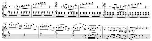 Often in music, the transition is the middle section or formal function, while the main theme is the beginning, and the subordinate theme is the ending.[2] It may traditionally be a part of the sonata form's exposition in which the composer modulates from the key of the first subject to the key of the second, though many Classical era works move straight from first to second subject groups without any transition.