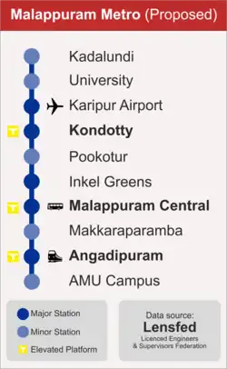 Malappuram Metro Rail[19] is a proposed mass transit system for the city by Lensfed (Licensed Engineers & Supervisors Federation). The proposal was considering the future urban scenario which would demand a transport system that can cater to the million plus population of the Malappuram urban agglomeration. In April 2012, Lensfed submitted detailed project report to Government which proposed 8 major stations and 9 intermediate stations out of which three elevated stations at Malappuram Central, Kondotty and Angadipuram. The alignment is similar to the proposed railway line of Calicut-Malappuram-Angadipuram. Apart from this, there is a proposal to extend proposed Kozhikode Light Metro Rail network to Malappuram during its third phase of expansion, paving a way to Calicut-Malappuram 'Urban Corridor' concept. Original Kadalundi is a village in Kozhikode district, Kerala, India. Kozhikode-673302. It is a coastal village close to the Arabian Sea. Kadalundi is famous for its bird sanctuary. Different district Kozhikode and Malappuram. Original KadalundiNagaram is a village in Malappuram district. KadalundiNagram include Vallikunnu in Malappuram. Malappuram-673314