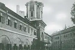 The Transylvania Barracks were 483 meters long and consisted of a single floor.[4] They formed an irregular arch, extending from the Joseph Bastion to the Hamilton Bastion of the old fortress. The building's layout featured eight corners, with only two of them forming right angles. The foundations of the medieval fortress walls were repurposed for the construction, which took place on the site of the fortress's old moats. This resulted in the building's distinctive, curved shape.[5] The simple structure was topped with a series of double windows and relief arches on the ground floor. The gate tower, designed in 1727 and completed the following year, stood 20 meters tall in the center of the complex.[4] It was built in an octagonal shape on a square base, adorned with a Baroque cornice, and featured four oval windows beneath it. The barracks housed living quarters across two floors, accommodating ten companies with their officers, not including the general and minor staff. The infantry used the vaulted rooms as stables, wagon sheds, or cellars, and a significant portion of these spaces were converted into prisons for both military and provincial civilian prisoners.[6][7]