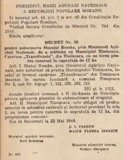 The Transylvania Barracks were transferred to the city hall by the Ministry of National Defense for demolition in order to facilitate the city's urban planning, through Decree No. 36 on 22 May 1948. The decree was signed by Constantin Ion Parhon, president of the Presidium of the Great National Assembly, along with Marin Florea Ionescu, Emil Bodnăraș, and Teohari Georgescu.[9] The decommissioning and demolition process began in 1956, with the land surrounding the barracks being enclosed by a wire fence until 1958. The actual demolition took place between 1961 and 1965. Due to the building's thick walls, designed to withstand sieges, the demolition proved challenging, with authorities at the time prohibiting the use of dynamite. The bricks from the demolition were carefully cleaned and stored for future reuse, following a similar approach to the defortification of the fortress.