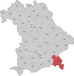 Traunstein is located in southern Bavaria. As of the 2021 federal election, it comprises the districts of Berchtesgadener Land and Traunstein.[1]