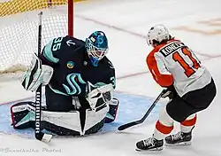 Heading into the 2018–19 season, Hakstol wanted to give Konecny a chance not only as the top line right winger, but on the Flyers' penalty kill unit, which had suffered the previous year.[43] Through the first 10 games of the season, however, a number of skaters saw their positions rotate, with Konecny playing at various points alongside Giroux, Couturier, Nolan Patrick, Oskar Lindblom, and Jordan Weal.[44] His position on the team solidified when the Flyers made a number of front office moves in December, with both Hextall and Hakstol ousted from their respective positions.[45][46] Finishing the year on a line with Giroux and James van Riemsdyk, Konecny scored 24 goals and recorded 49 points while playing all 82 regular season games. While his numbers were similar to the previous season, Konecny's output was more consistent in 2018–19: his worst stretch involved six points in 14 games in December, compared to the previous season's first-half drought.[45] He also completed his first career Gordie Howe hat trick that season, with a goal and an assist against Henrik Lundqvist and a brawl with Ryan Strome in a 4–0 shutout win over the Rangers on November 23.[47]