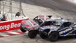 Team Traxxas drivers Sheldon Creed and P. J. Jones competing in the Stadium Super Trucks race at Long Beach in 2014