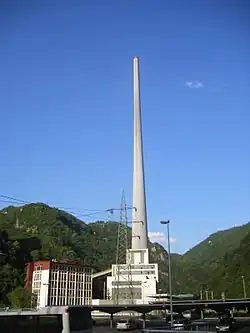 Coal mining began at Beech Mountain (Slovene: Bukova gora, 547 meters or 1,795 feet) south of the town in 1804.[7] The town was connected to the Austrian Southern Railway in 1849, which contributed to its further development. During the 19th century, a cement plant, mechanical separator, sawmill, and power plant were built in Trbovlje.[7][8]