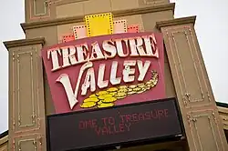Treasure Valley is a Native American casino located in the Arbuckle Mountains of Davis, Oklahoma in the south-central part of the state. Owned and operated by the Chickasaw Nation, the gaming center was opened in July 2003.[1][2] The Inn at Treasure Valley is a 59-room hotel[3] has an indoor swimming pool and jacuzzi, continental breakfast, exercise room and dry sauna, as well as four conference rooms.[4] Overlooking the Washita River Valley and located along Interstate-35 and Highway 7 at Exit 55,[2] the 19,666 sq ft (1,827.0 m2)[5] Treasure Valley Casino is near several other key attractions in the area. It is 5.5 miles from Turner Falls and the Arbuckle Wilderness Exotic Animal Theme Park, and 13 miles from the Chickasaw Cultural Center. Treasure Valley is approximately 55 miles south of Norman, Oklahoma which is home to the Nation's sister gaming facility, Riverwind Casino, and 50 miles north of WinStar World Casino in Thackerville, Oklahoma.[6]