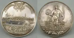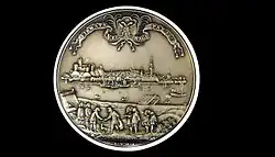 To commemorate the Treaties of Nijmegen, many medals and coins were made, sometimes from very expensive material. These were mainly French medallists who portrayed the peace of Nijmegen, but there were also Dutch craftsmen. Jacob van Dishoecke is the most distinguished of these artists.[3] This silver medal is a beautiful example of his work and was specially made to commemorate the peace treaties signed in Nijmegen. The medal features a panorama of the city of Nijmegen with various negotiators in the foreground. At the top are the city arms on a banderole, with the words: FIRMATA NEOMAGI PAX 1678 (peace signed in Nijmegen 1678).