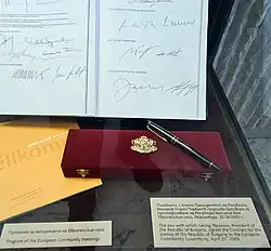 On 22 February, the 2005 European Commission delivered a favourable opinion on the accession to the European Union of Bulgaria and Romania.[2] As a result, on 13 April 2005, the European Parliament gave assent to the applications of Bulgaria[3] and Romania[4] to become members of the European Union. The parliament voted in favour of Romania with 497 positive votes, 93 negative votes and 71 abstentions, while Bulgaria received 522 votes in favour, 70 votes against and 69 abstentions.[5] On 25 April 2005, Council of the European Union accepted the applications for admission of Bulgaria and Romania.[6]