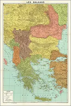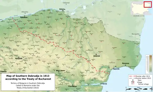 Following the Second Balkan War, in which Romania's intervention proved decisive, and the subsequent 1913 Treaty of Bucharest, Romania's dominant position in Southeastern Europe was confirmed. Romania also gained Southern Dobruja from Bulgaria.[7] Romania also raised the question of the Balkan Vlachs (that is, the Aromanians and Megleno-Romanians), whom it considered its compatriots. Too distant to be annexed, however, Romania took Southern Dobruja as compensation. Romania was the strongest nation in the Balkans, and thus it believed that it had to acquire territory, given that its neighbors were being aggrandized. Romania's argument that it had turned the scales of the war was accepted without serious objections, due in part to Bulgaria's attitude not attracting much compassion.[8] Despite not annexing the areas inhabited by Balkan Vlachs, Romania nevertheless obtained protection of the schools and churches of the Vlachs in the other Balkan states.[9] Thus, Romania was the only Balkan country to obtain guarantees from all three of its neighbors, which pledged to recognize its interest in, and respect the autonomy of the Balkan Vlachs.[10]