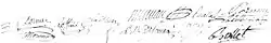 On behalf of the French Republic, the treaty was signed by Ruelle, Delaunay, Pomme, Brue, Lofficial, Chaillon, Bollet, Jary, Menuau, Dornier and Morrisson. On behalf of the Catholic Royalists it was signed by Charette, Fleuriot, Couëtus, Cormatin, de Bruc, Guérin the older, Caillaud, de Foignard, Goguet, Lepinay, Sauvaget, Baudry, Guérin the younger, Solilhac, Béjarry, de Bruc the younger, Prudhomme, Rejeau, de la Roberie, Rousseau, Bossard the younger and the older son of Auvinet.[4] The leader of the Catholic and Royal Army, Jean-Nicolas Stofflet, who did not arrive at Nantes until 18 February, refused to sign the treaty, and only eventually did so on 2 May at Saint-Florent-le-Vieil.