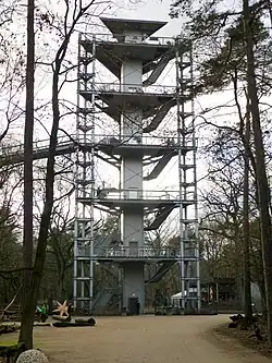 In the northwest part of the area, there is a prominent landmark, a 40.5 meter high viewing tower constructed in steel with a triangular base, whose five levels can be reached either by an elevator or via a staircase built around the elevator shaft. Access to the tree-top walk is from the third level of the tower, which is at a height of 21.6 meters. The top fifth level, at 36 meters, serves as a viewing platform.[4] On this level, there are information panels about the surrounding buildings as well as a telescope. From here, there is an excellent view of the extensive grounds of the sanatorium and, with good visibility, as far as the Fläming region to the south and Berlin to the north.