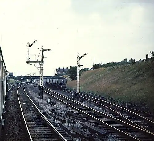 The line here consisted of four tracks. The platforms served the centre two with access by steps from the adjacent road bridge.[2] The goods lines were routed to the rear of the platforms in an arrangement similar to that at Brightside in Sheffield.[3]