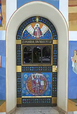 The round-arched entrance door to the chapel is decorated with copper repoussage and enamel paintings.[7]: 219 The lower door panel depicts Michael the Archangel standing before a disc of the world with his sword raised. The world disc is surrounded by the inscription "Who is like God. Saint Michael". The arched panel of the door shows Our Lady of Mariazell in a mandorla above the inscription "O MARY ALWAYS HELP". The two panels are separated by a mullion, through which it is possible to see the interior of the chapel.[5]: 113