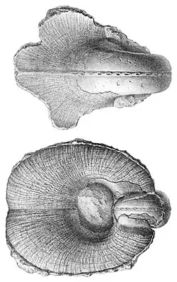| Drawing of dorsal view and ventral view of the shell of Boiotremus longitudinalis. Head region is on the left. | |