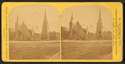 Prior to 1862, the Methodist Episcopal congregation had occupied the Hedding Church on Pelham Street in Boston for some 20 years.[3] The congregation's new church building, located at 740 Tremont Street, "is a large, Gothic, natural-quarry stone building, with two spires, respectively 150 feet and 100 feet high."[1]