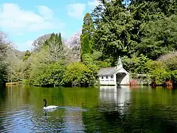 - The lake and Victorian boathouse, which is now a listed building. Water runs down from the lake through a 1 mile (1.6 km) series of cascades to Trevarno Watermill.[2]